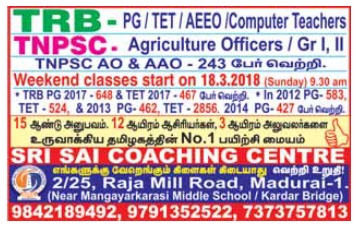 நாளை ஆசிரியர் தகுதித் தேர்வுக் காண பயிற்சி வகுப்புகள் துவங்குகின்றன. நடைபெறும் இடம் - ஸ்ரீ சாய் பயிற்சி மையம் பஸ் ரூட்: பெரியார் நிலையத்தில் இருந்து வருபவர்கள் மதுரை சேதுபதி மேல்நிலைப் பள்ளி பேருந்து நிறுத்தத்தில் இறங்கி மீனாட்சி பஜார் வழியாக வர வேன்டும். ஆரப்பாளையம் பேருந்து நிலையத்தில் இருந்து வருபவர்கள் - சிம்மக்கல் செல்லும் ஷேர் ஆட்டோ வழியாக வரவும். மாட்டுத்தாவணி பேருந்து நிலையத்தில் இருந்து பெரியார் நிலையம் பஸ்ஸில் வருபவர்கள் மதுரை சேதுபதி மேல்நிலைப் பள்ளி பேருந்து நிறுத்தத்தில் இறங்கி மீனாட்சி பஜார் வழியாக வர வேன்டும். மாட்டுத்தாவணி பேருந்து நிலையத்தில் இருந்து ஆரப்பாளையம் பேருந்தில் வருபவர்கள் மதுரை தமிழ்சங்கம் ரோடு அல்லது சந்தைபேட்டை பேருந்து நிறுத்தத்தில் இறங்கி ஸ்ரீ சாய் பயிற்சி மையத்திற்கு வருகை புரியவும். "உங்களது இலக்கை நனவாக்கும் ஒரே பயிற்சி மையம் - எமது ஸ்ரீ சாய் பயிற்சி மையம் " பயிற்சி + முயற்சி = வெற்றி...! தொலைநோக்கு + இலக்கு + திட்டமிடுதல் = வெற்றி...!